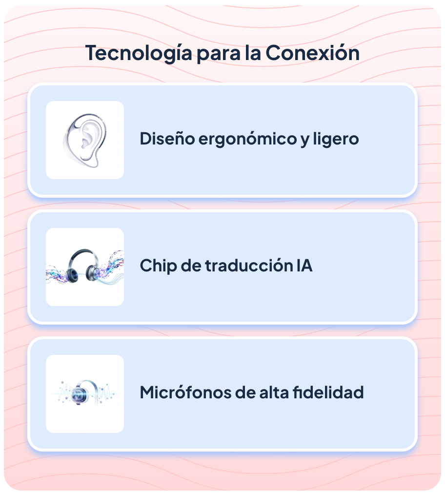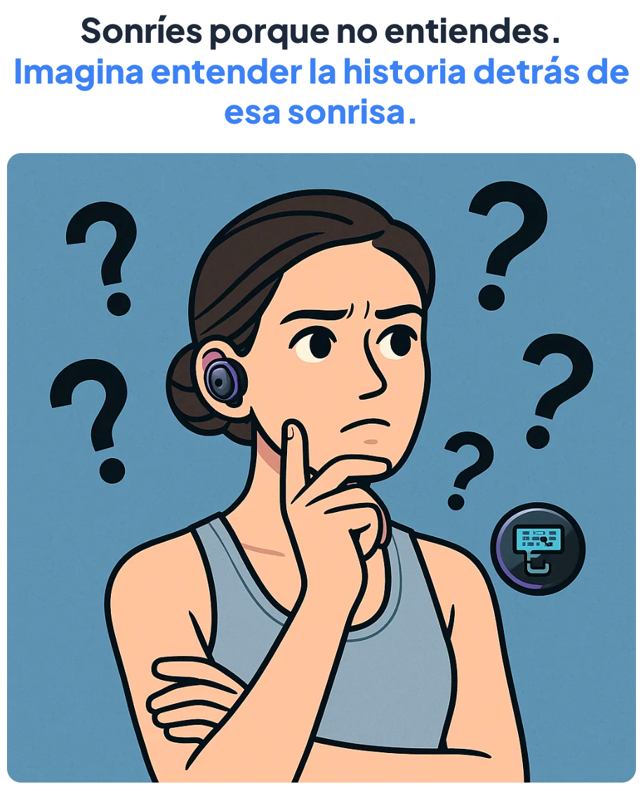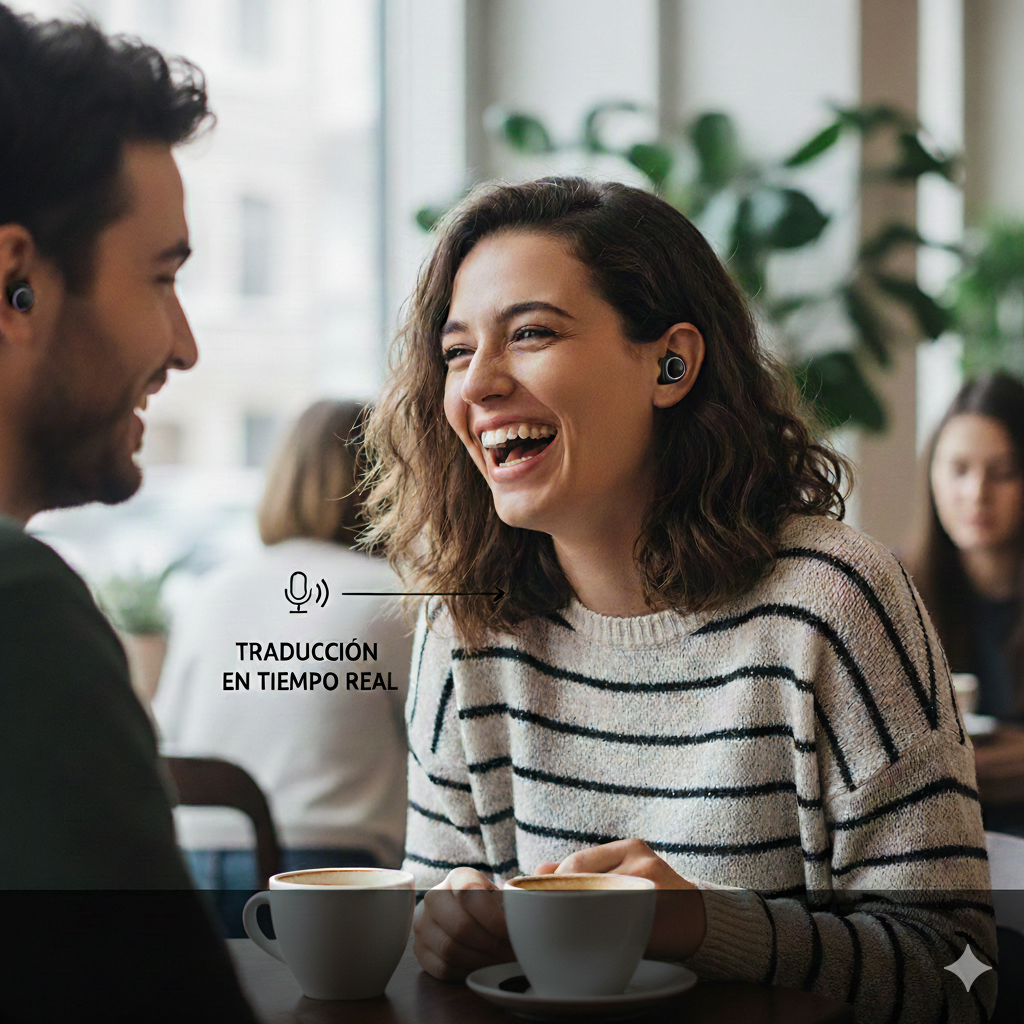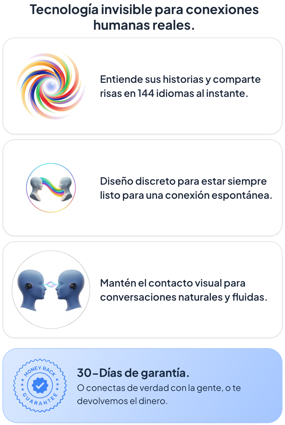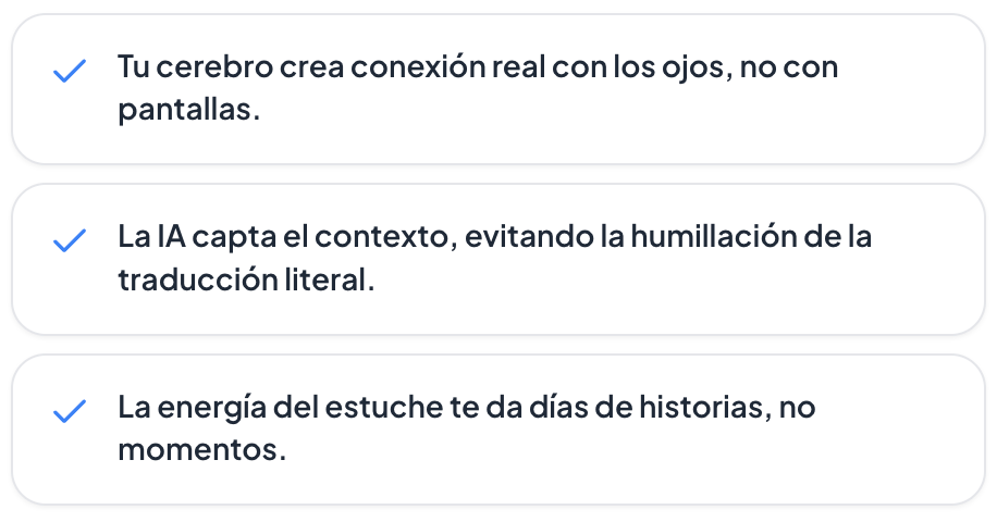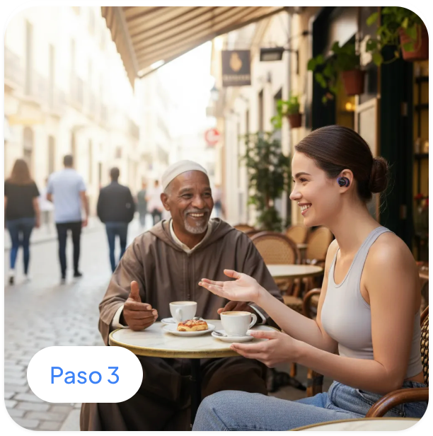 La conexión humana exige contacto visual. Nuestra IA traduce fluidamente, liberando tus ojos y manos para que puedas conectar de verdad con otros.