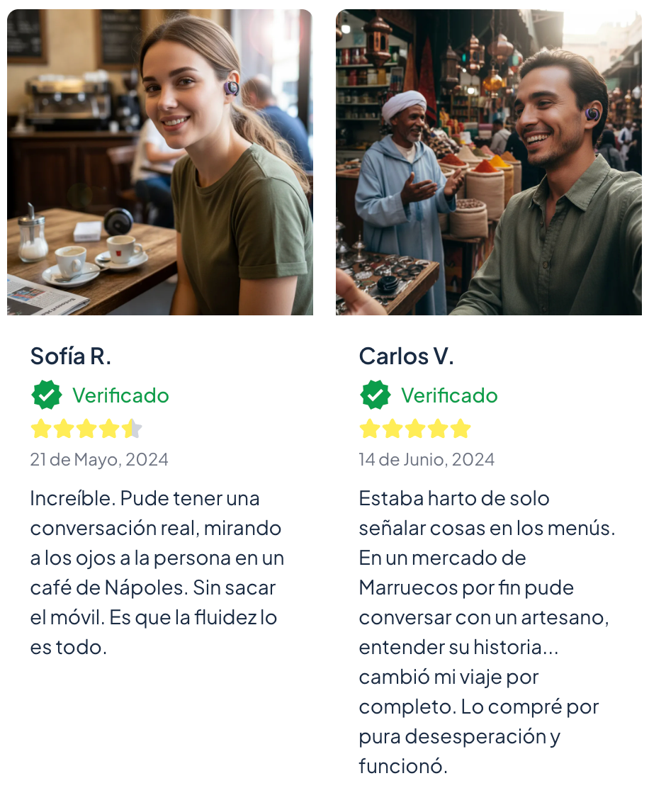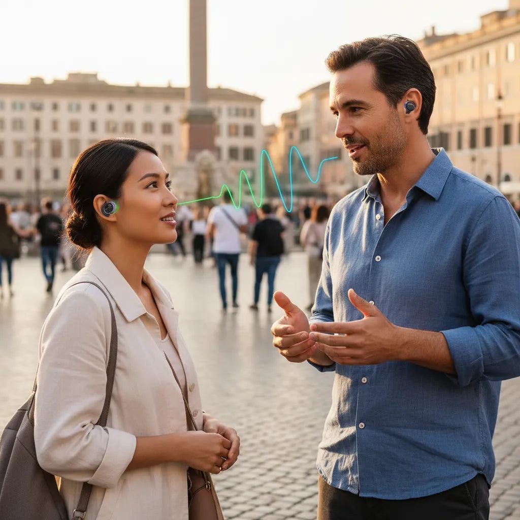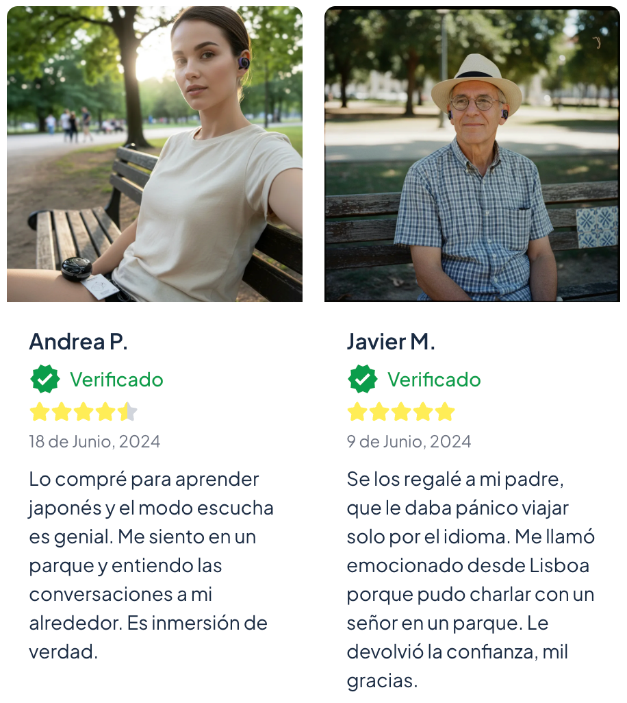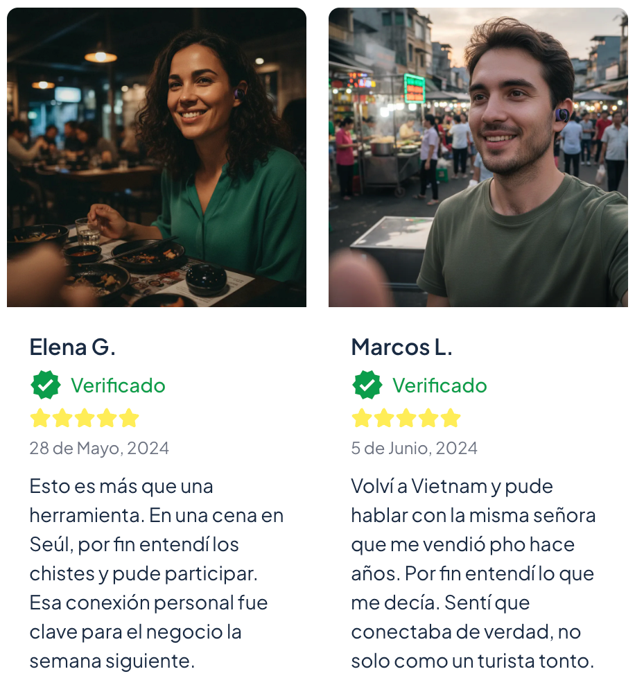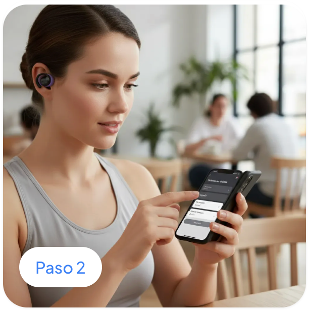 La conexión humana exige contacto visual. Nuestra IA traduce fluidamente, liberando tus ojos y manos para que puedas conectar de verdad con otros.