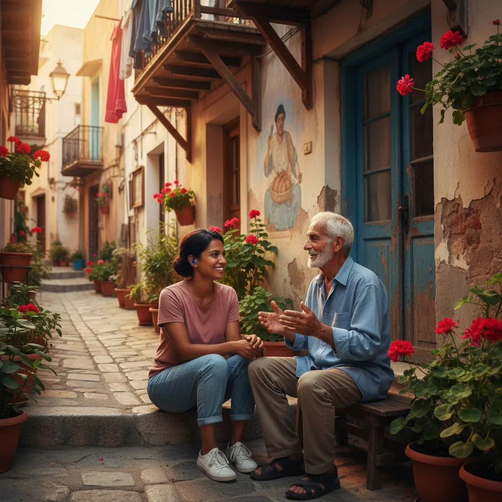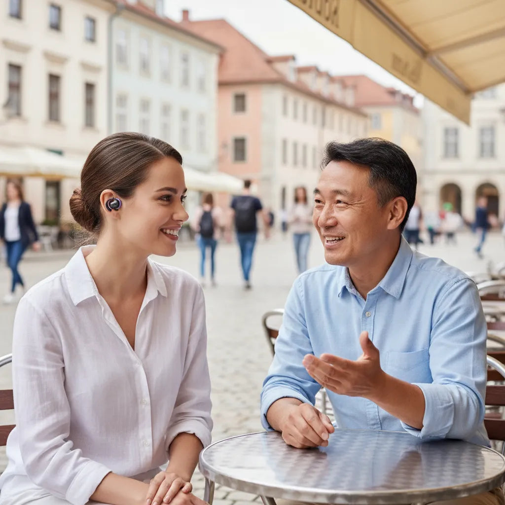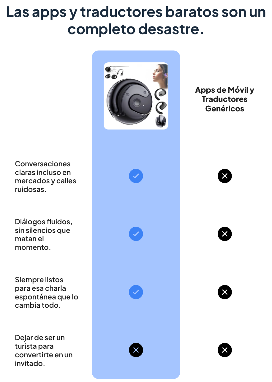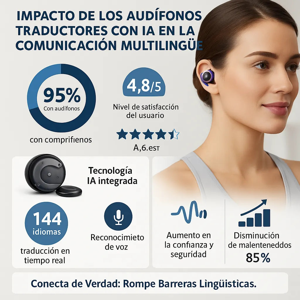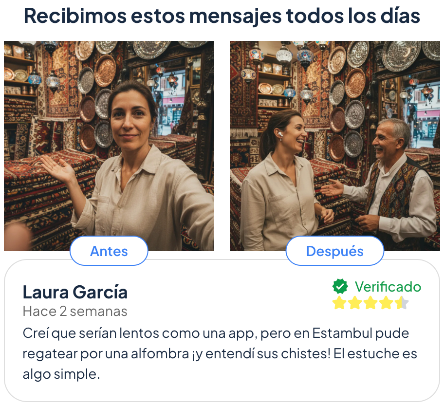 La conexión humana exige contacto visual. Nuestra IA traduce fluidamente, liberando tus ojos y manos para que puedas conectar de verdad con otros.