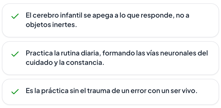 Es el primer paso. Aprende la rutina de cuidar y atender a su amigo, creando el hábito de la empatía sin el riesgo real.